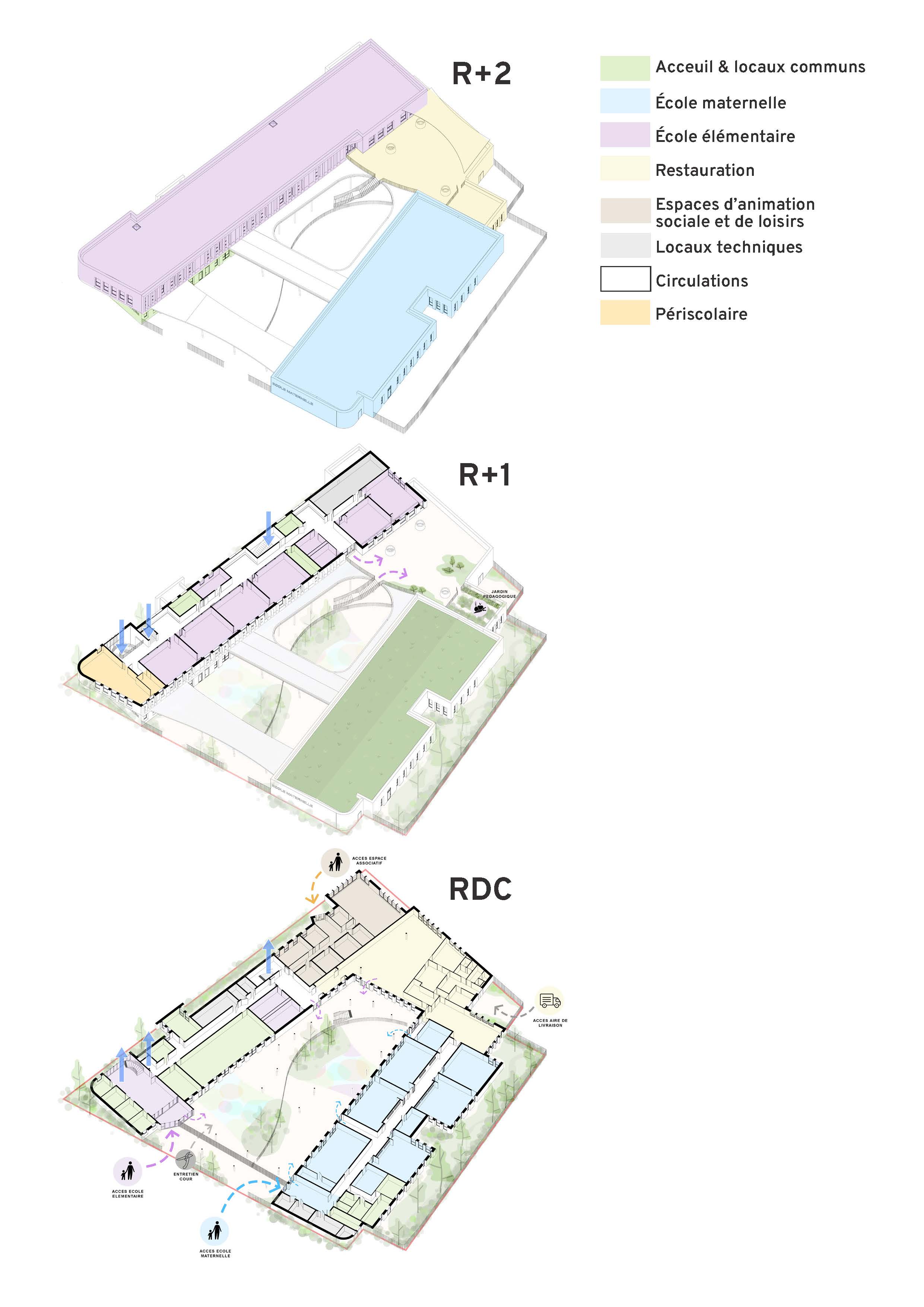 Conçu pour être modulable et durable, le bâtiment utilise des matériaux polyvalents et une toiture végétalisée pour un cadre sain et adaptable.