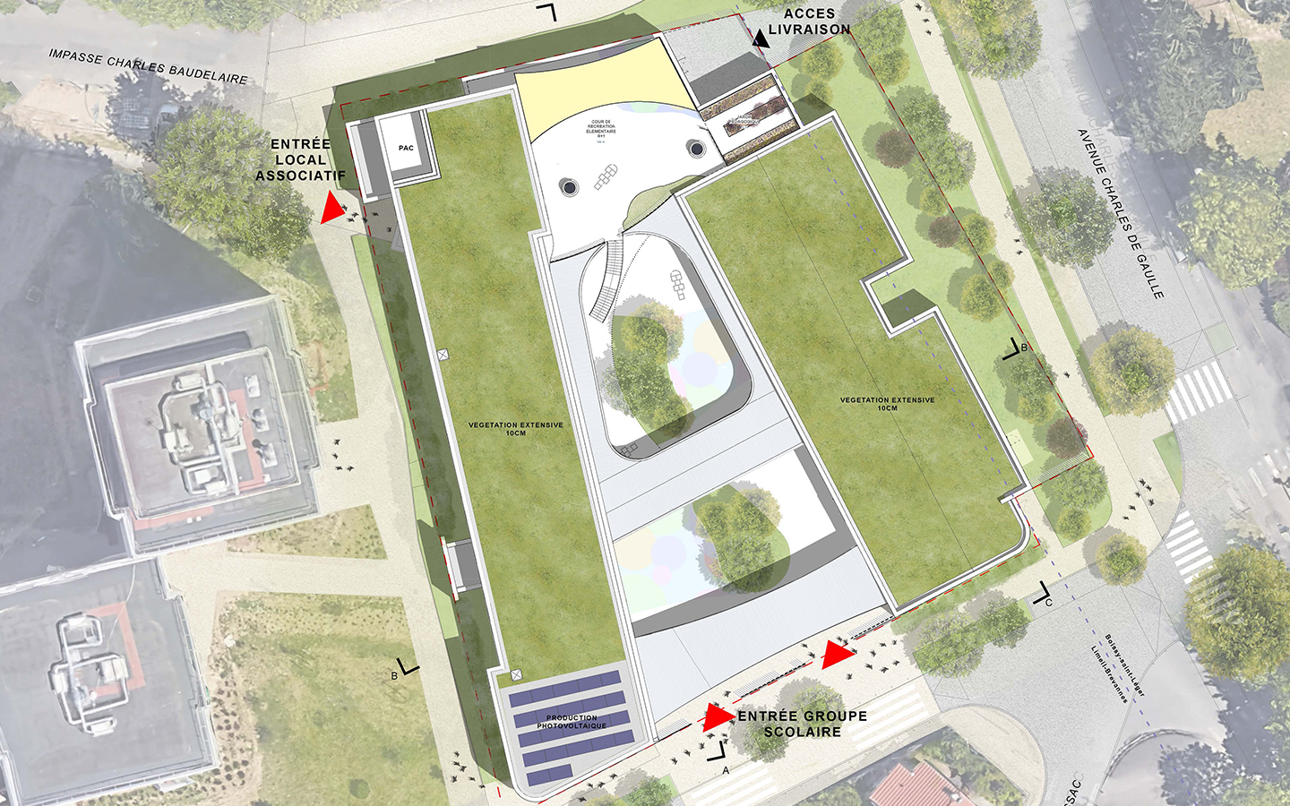 Le nouveau groupe scolaire de Limeil-Brévannes comprend une école maternelle et une école élémentaire, des espaces de restauration et d’animation, intégrés dans un environnement lumineux et verdoyant. L’architecture chaleureuse garantit sécurité et confort, avec des cours centrales protégées de toute vue extérieure.