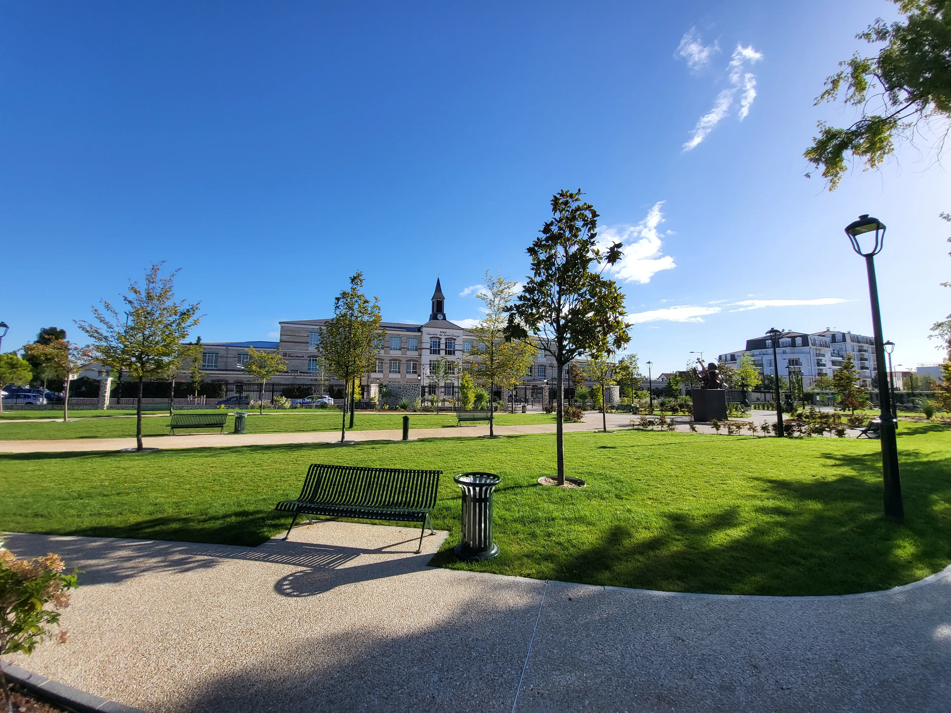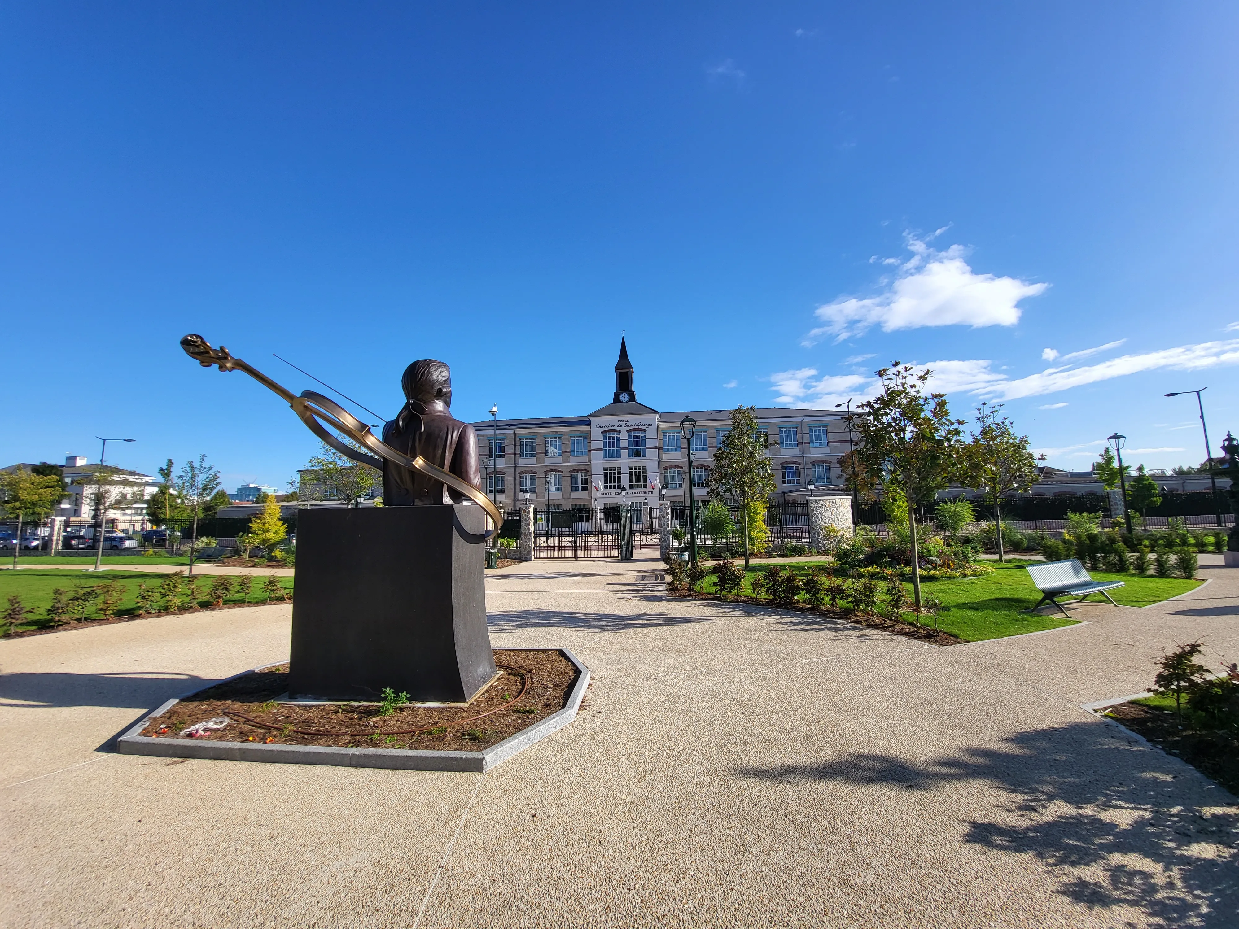 Différents cheminements parcourent l’ensemble du parc pour créer une trame paysagère, alternant différentes essences végétales et points d’intérêts. Véritable poumon vert, le parc Joseph Bologne, du nom du célèbre musicien et escrimeur du 18eme siècle, se veut être un lieu de rassemblement et de convivialité pour l’ensemble des Blanc-Mesnilois. En hommage au célèbre compositeur, une oeuvre représentant un buste couronné des symboles qui lui sont attribués fera face à l’école qui porte aujourd’hui son titre.