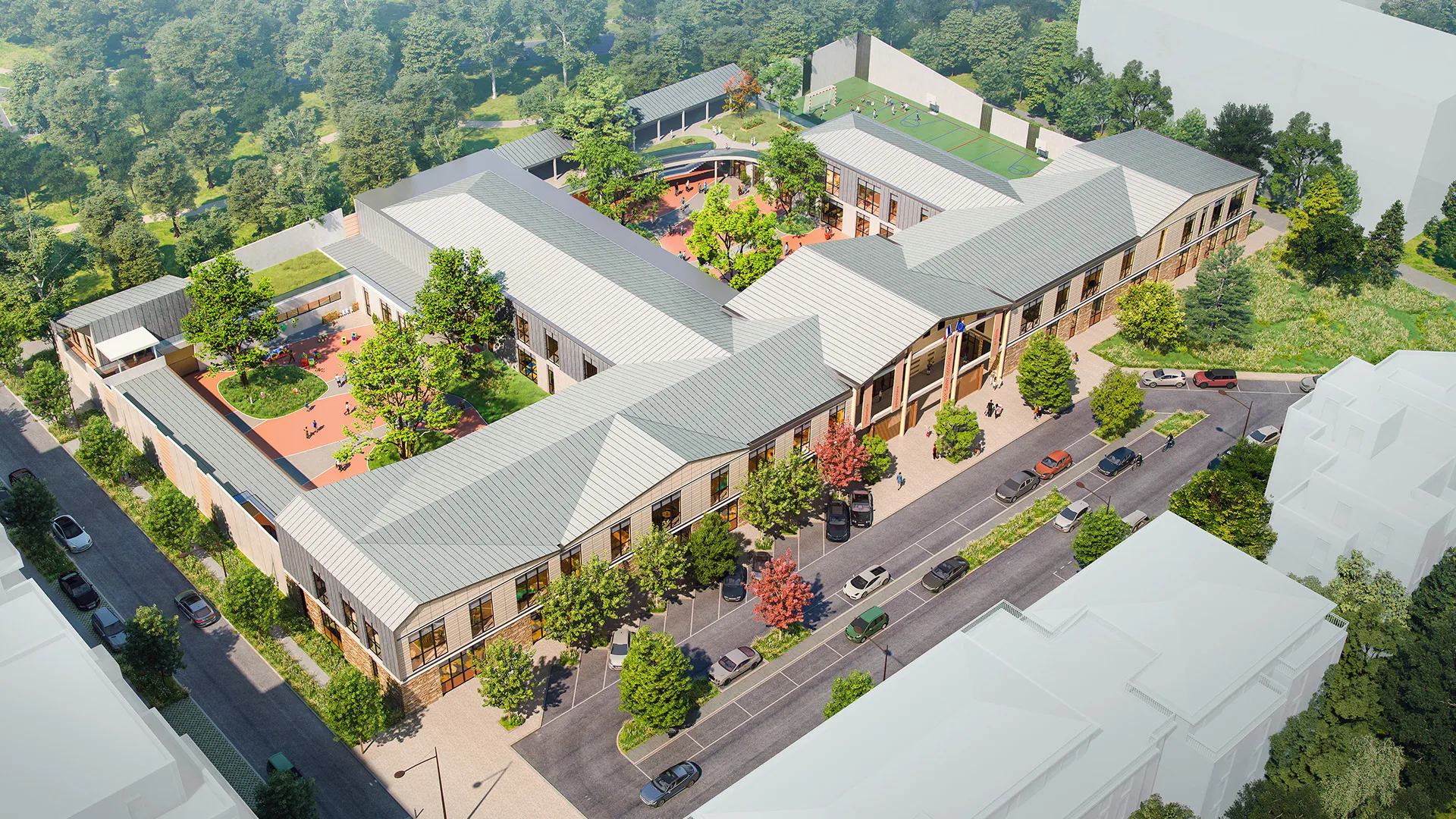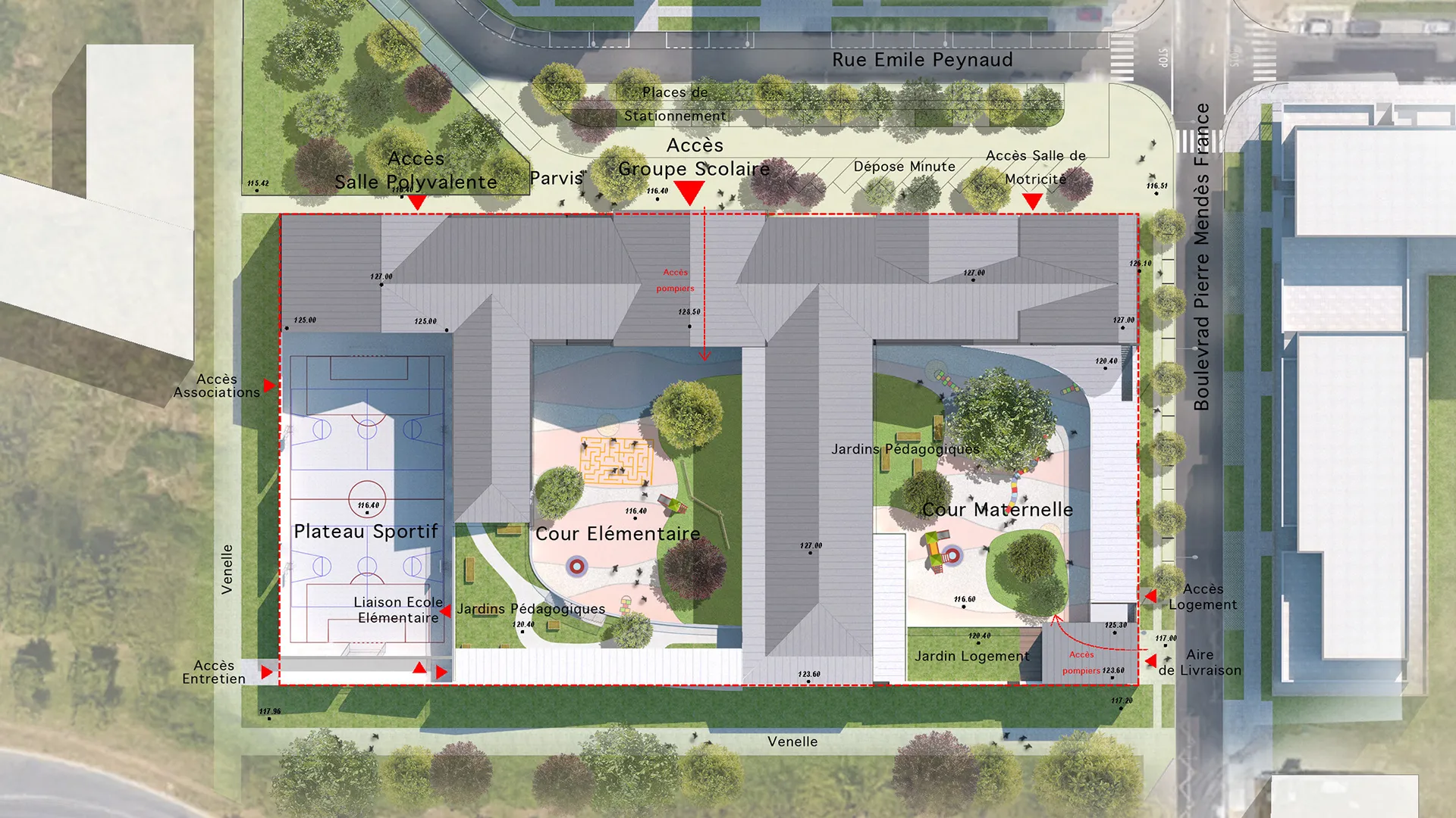 Le programme répond à plusieurs ambitions : respect du budget et des délais, haute performance environnementale, cohérence urbaine et relation forte avec le site. Les façades associent matériaux durables (terre cuite, zinc, béton lasuré, végétation grimpante) et isolation performante, tandis que les toitures en zinc anthracite offrent une identité singulière. L’aménagement du parvis central, sécurisé et piéton, constitue un espace de transition convivial, desservant maternelle, élémentaire et périscolaire, tout en intégrant des stationnements et une zone de dépose minute.