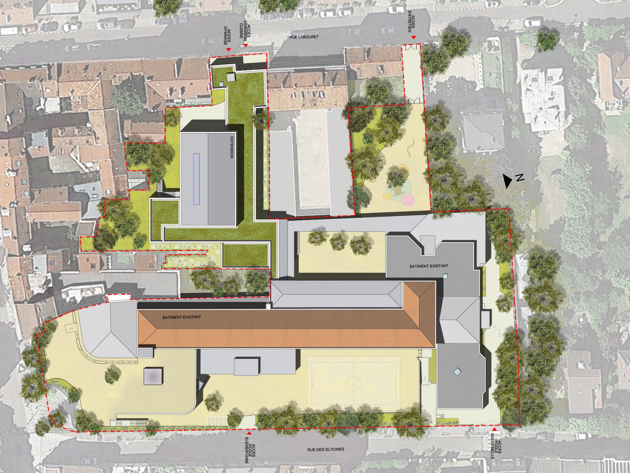 Au regard de l’histoire et de la forte personnalité de l’édifice existant, nous avons fait le choix de faire perdurer la mémoire identitaire du lieu en mettant en place une organisation simple, à l’image des équipements scolaires de cette époque, permettant des accès fluides et préservant ainsi l’intégrité architecturale existante. L’objectif de notre projet est de récréer un front bâti sur rue et de proposer une organisation permettant de concilier l’accessibilité, l’agrément et le confort tout en identifiant et différenciant clairement les flux des élèves « élémentaire » et « maternelle » et ainsi améliorer la lisibilité des accès et des circuits.