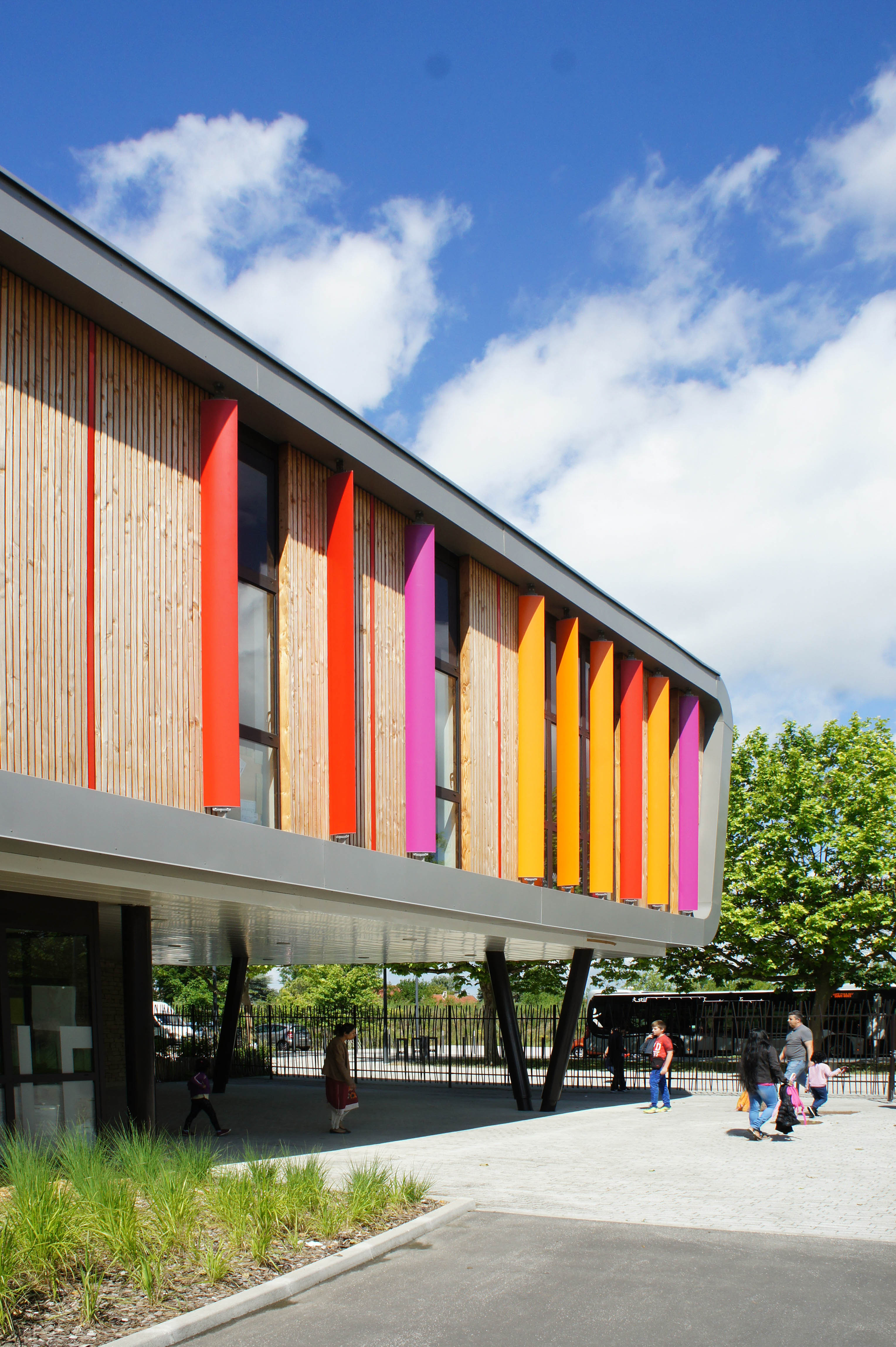 Notre volonté a été de constituer un front urbain de qualité, renforçant l’identité de l’équipement public tout en mettant en avant le caractère verdoyant du lieu. Avec ses volumes travaillés, ses couleurs lumineuses associées au matériau bois, l’école Denise Albert offre une architecture singulière, ludique et contemporaine et une ambiance chaleureuse et design à ses utilisateurs.