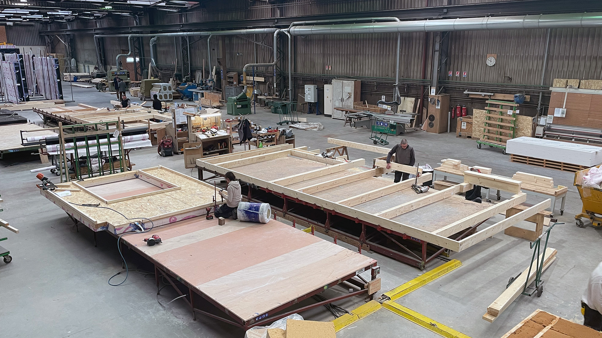 Ci-dessous, la préfabrication et le prémontage des murs dans les ateliers d'OBM (Entreprise générale mandataire) :