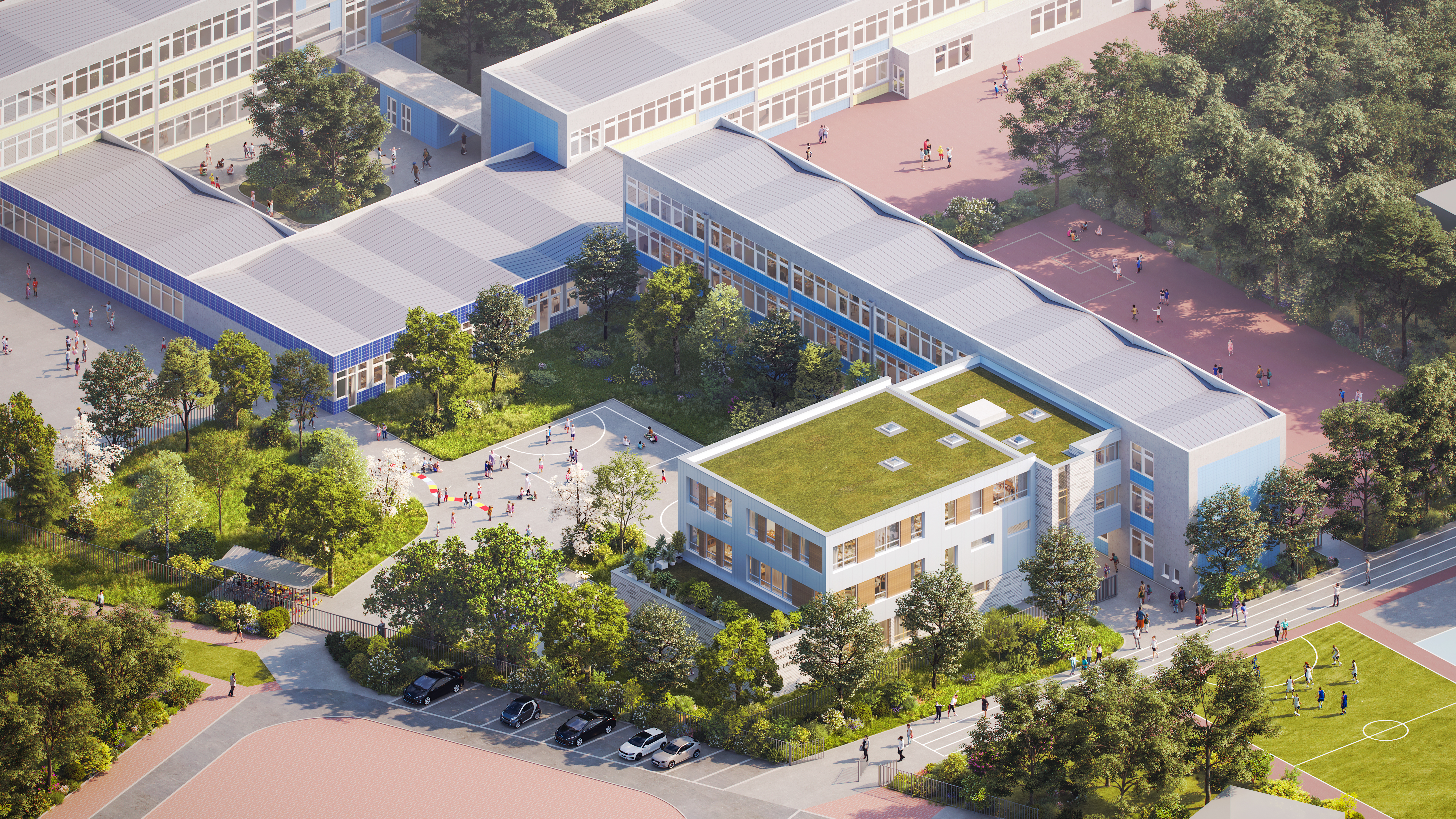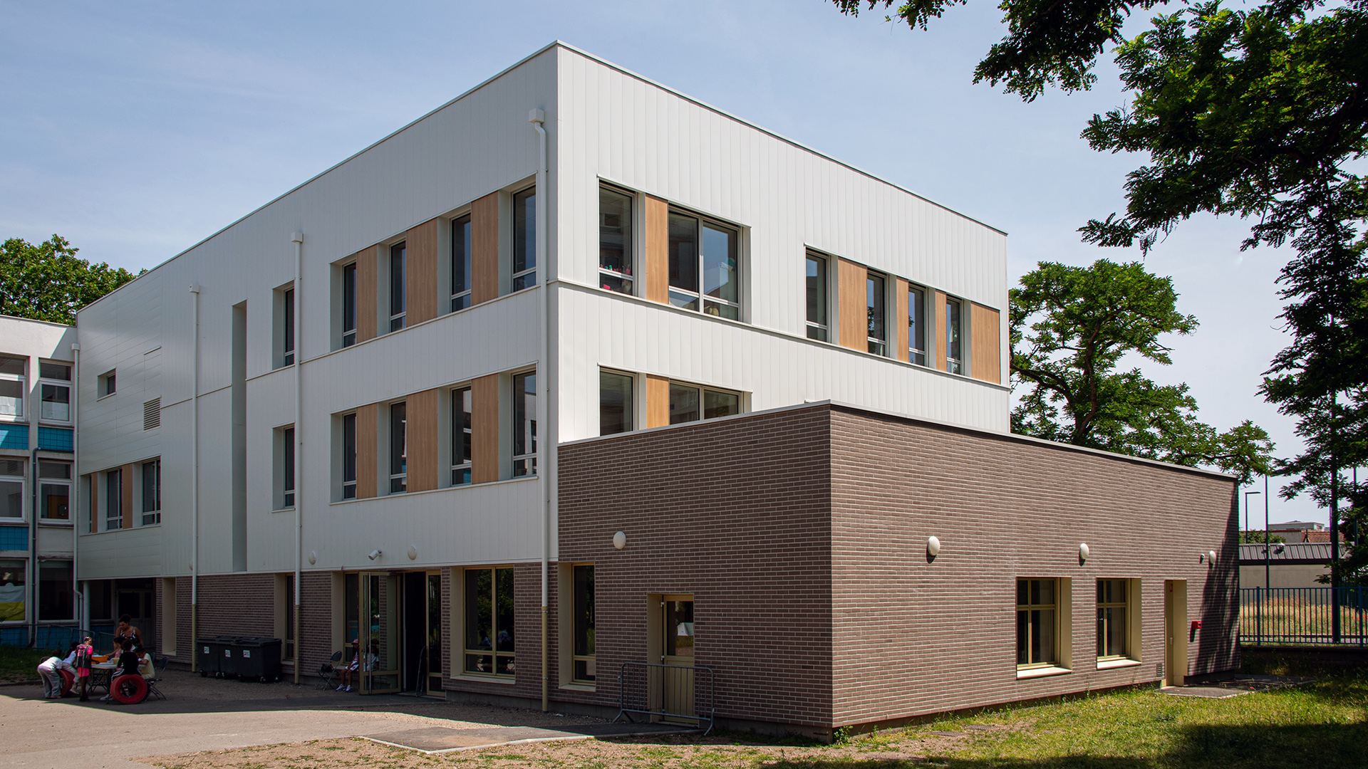 Le bâtiment de 3 niveaux, en relation avec le groupe scolaire voisin, distingue clairement les différentes fonctions. Il est conçu avec des matériaux biosourcés et une architecture moderne, favorisant lumière naturelle et confort d’usage. L’isolation thermique est renforcée (toiture végétalisée, grandes ouvertures, brise-soleil), offrant un environnement sain et agréable. Les façades sont en brique, sur une structure en bois, garantissant durabilité et faible entretien. Ce choix réduit les coûts de maintenance tout en offrant une architecture résistante aux chocs.