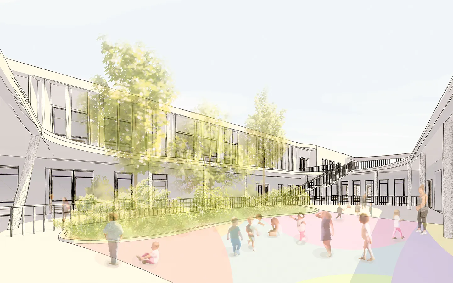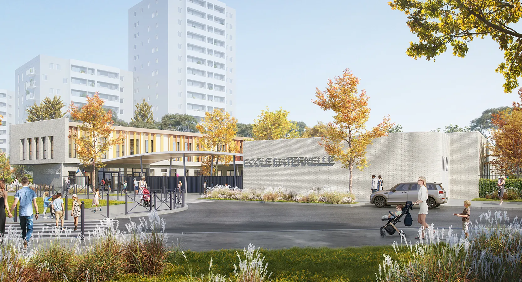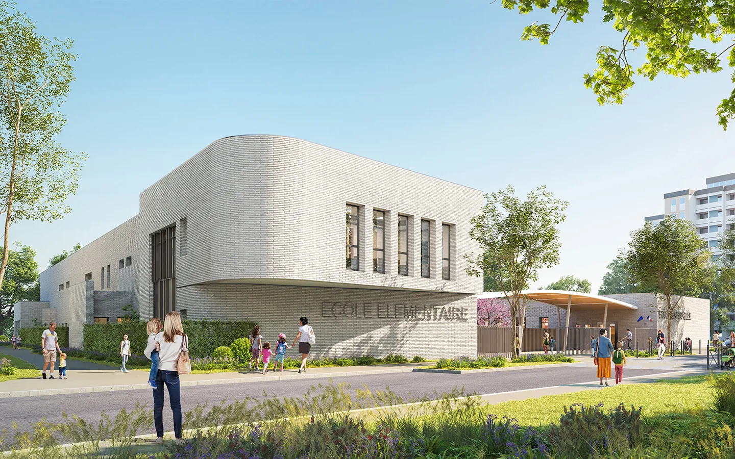 Le nouveau groupe scolaire de Limeil-Brévannes comprend une école maternelle et une école élémentaire, des espaces de restauration et d’animation, intégrés dans un environnement lumineux et verdoyant. L’architecture chaleureuse garantit sécurité et confort, avec des cours centrales protégées de toute vue extérieure.