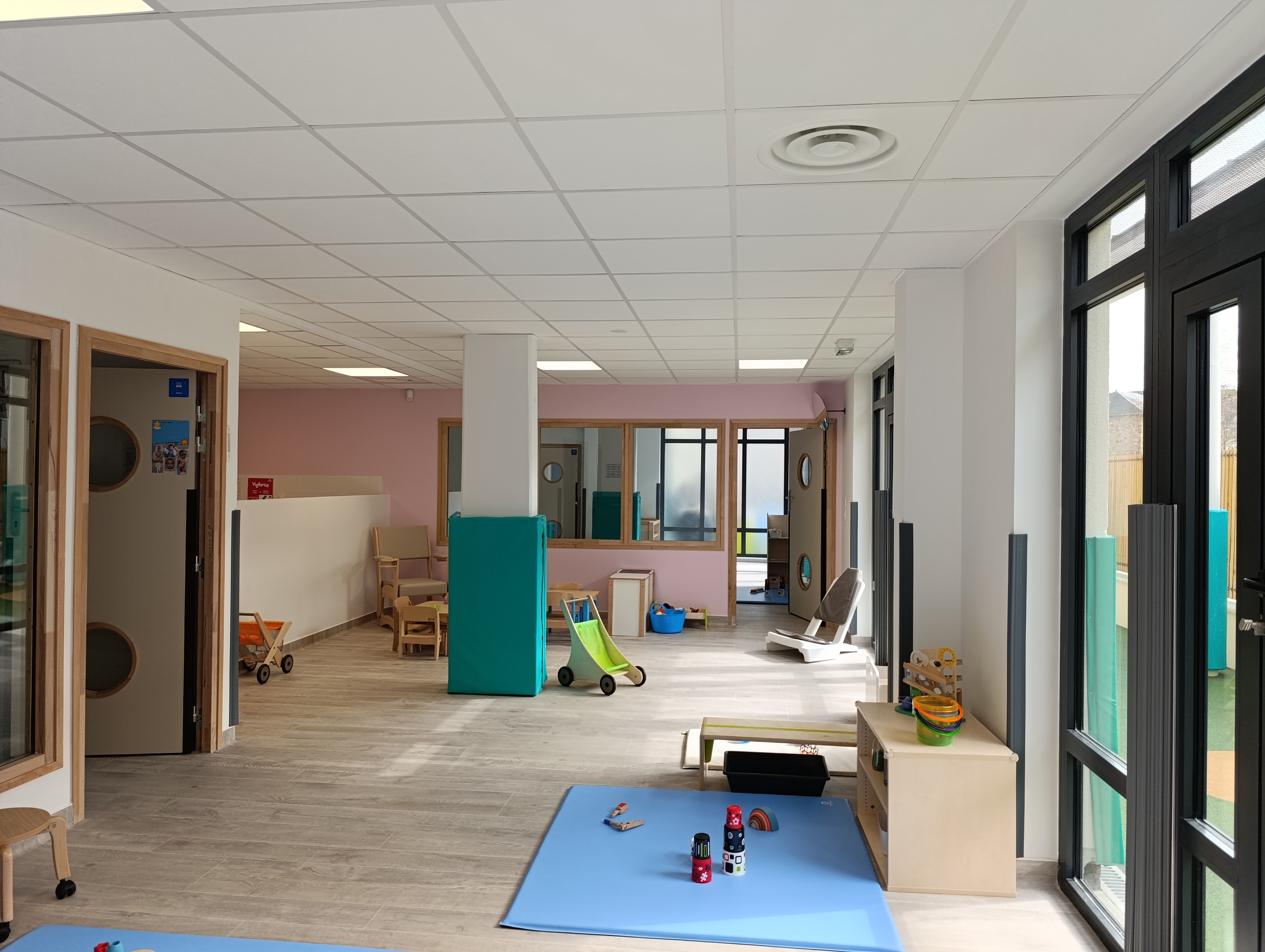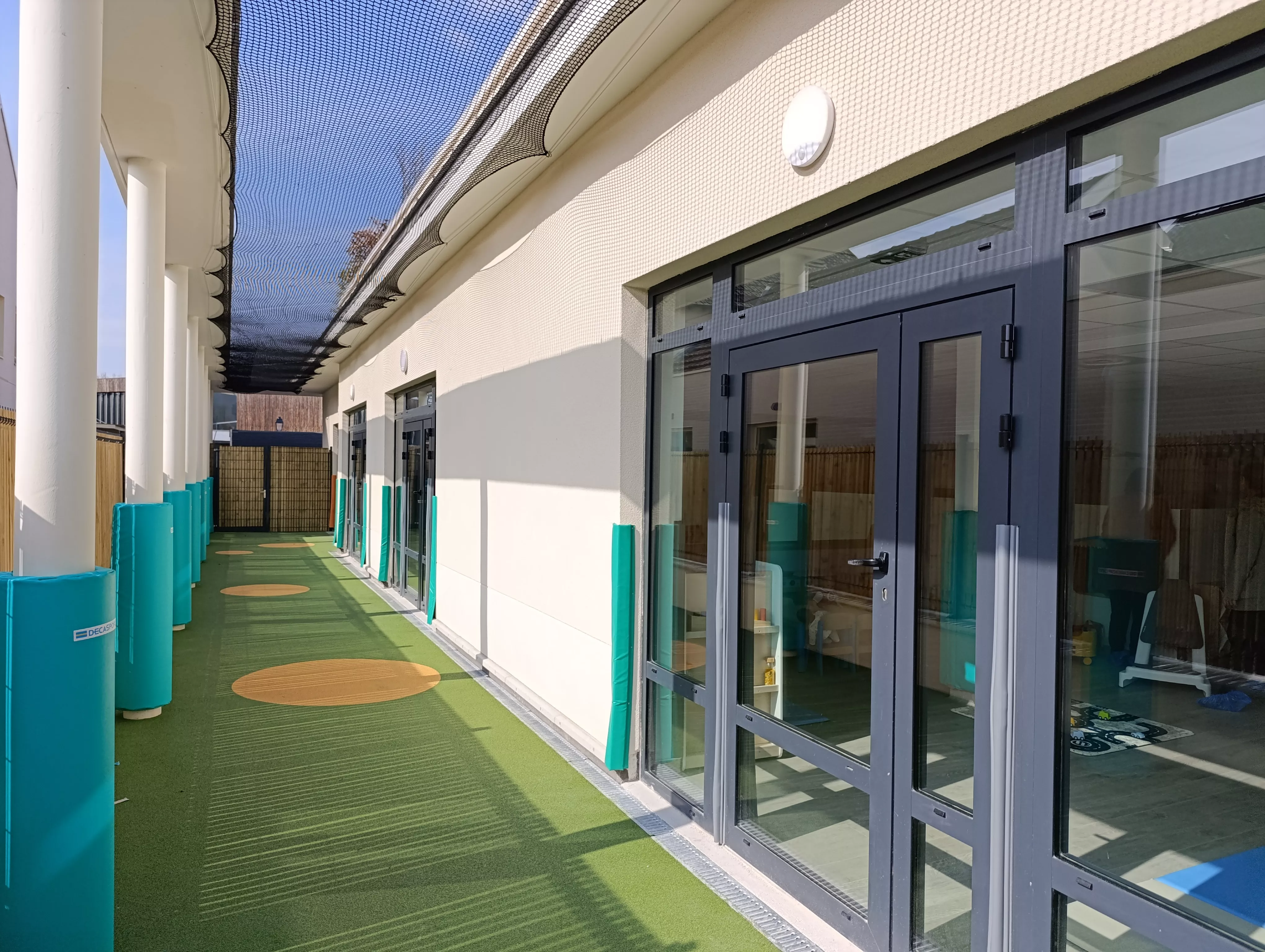 L’aménagement du multi-accueil pour la petite enfance à Saint-Rémy-lès-Chevreuses (78) consiste en la transformation d'une "coque vide" avec un aménagement complet des locaux. Aucun changement n’a été apporté à la façade existante du bâtiment. Une zone de jeux a été aménagée, accompagnée d'un préau installé au-dessus de la zone en sol souple pour protéger les enfants du soleil pendant les fortes chaleurs.