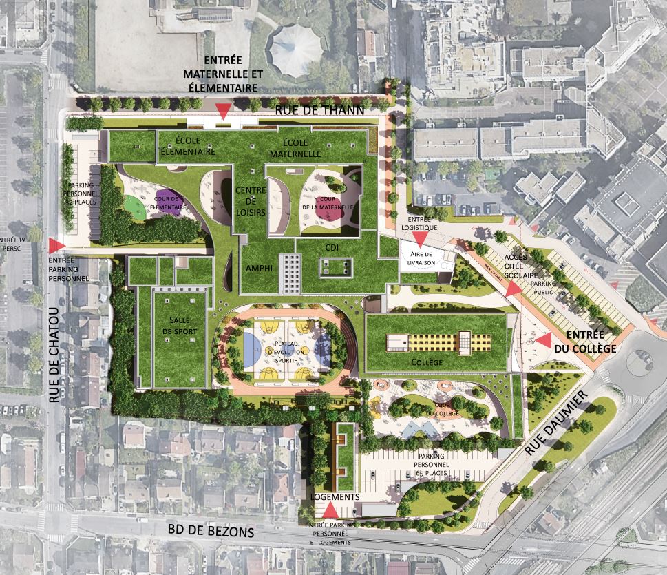 Le Conseil Départemental des Yvelines et la Ville de Sartrouville portent un projet de cité scolaire dans le cadre du renouvellement urbain du quartier des Champs Thibaux, sur une parcelle de 29 300 m², pour accueillir environ 1 200 élèves. Elle regroupe une école maternelle (remplaçant l’actuelle Jacques Prévert), une école élémentaire, un ALSH, un collège (remplaçant Romain Rolland) avec logements de service, ainsi que des espaces mutualisés tels qu’une demi-pension, un CDI, un amphithéâtre et des installations sportives. Le projet prévoit également des aménagements extérieurs (stationnements, espaces verts, circulations) et chaque entité fonctionne de manière autonome.
