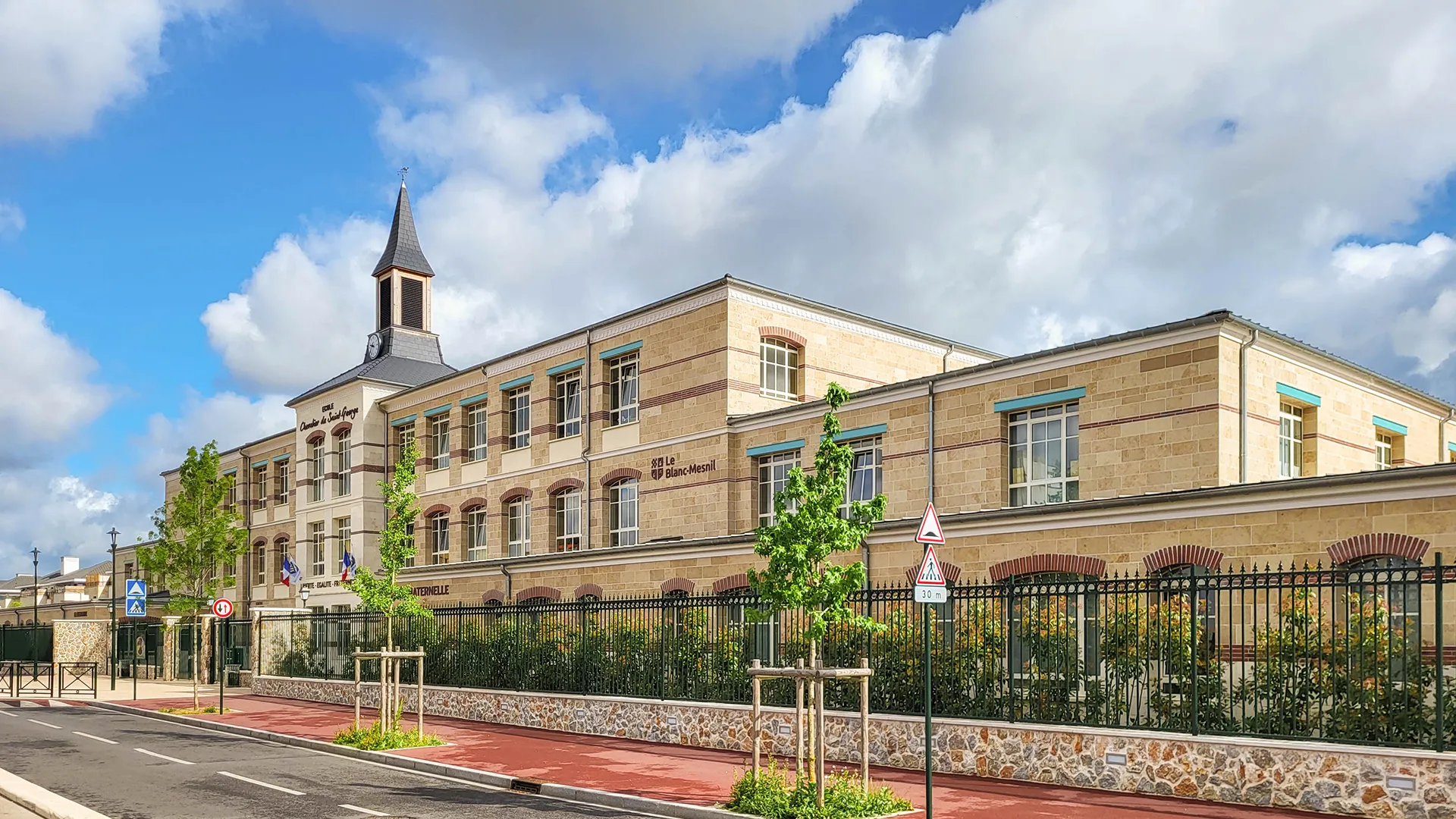 La ville du Blanc-Mesnil a souhaité un groupe scolaire respectueux de l’environnement, avec une architecture néoclassique et des espaces verts. Il comprend 23 classes, un centre de loisirs, des salles de restauration et un parking souterrain. L’école, dédiée à l’excellence musicale, met l’accent sur la qualité acoustique.