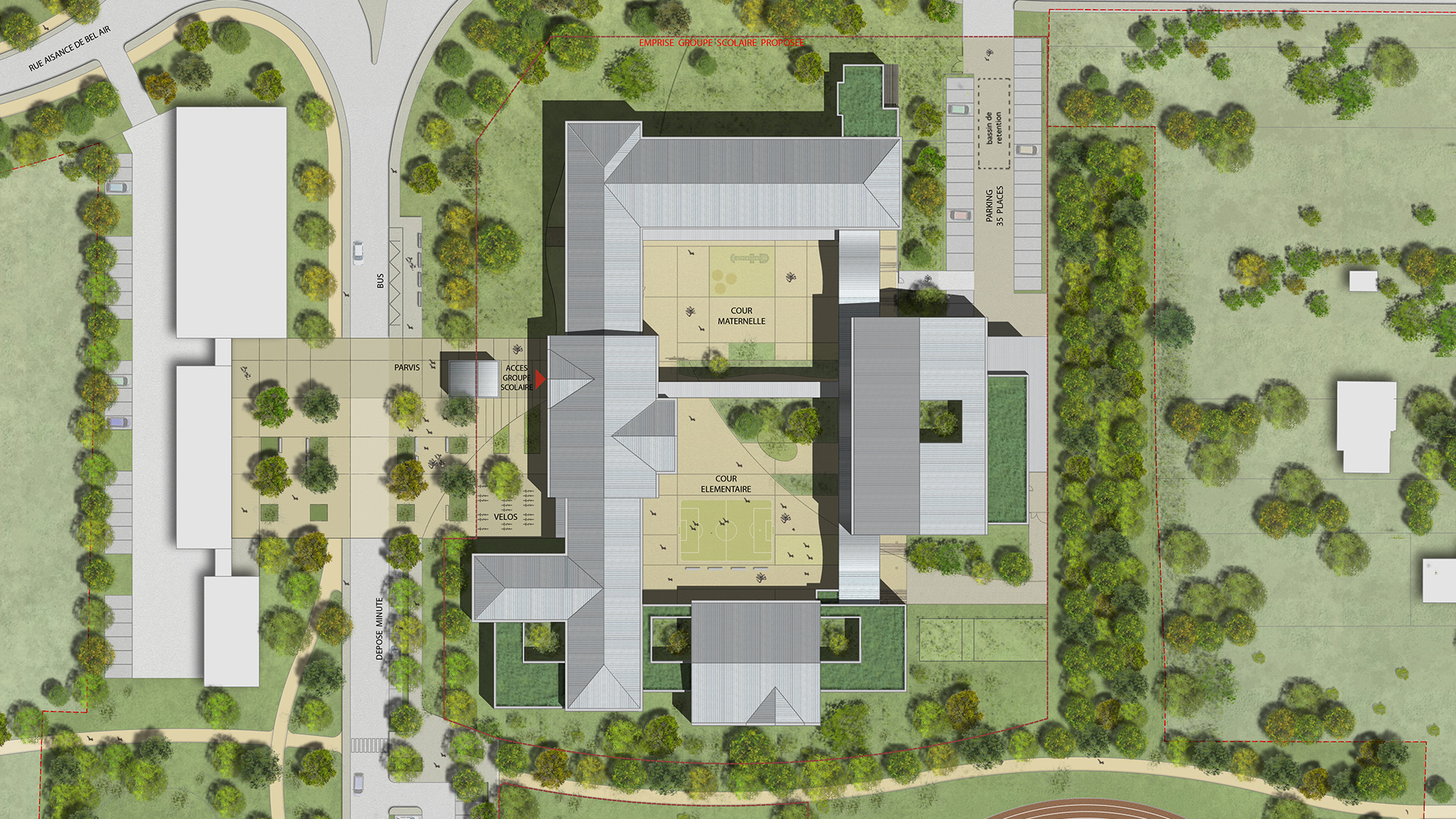 Les deux écoles sont positionnées de part et d'autre des espaces communs, créant un environnement sécurisé, avec des cours au centre, garantissant ainsi la protection des enfants, notamment des plus jeunes, contre les regards indiscrets et les voies publiques.