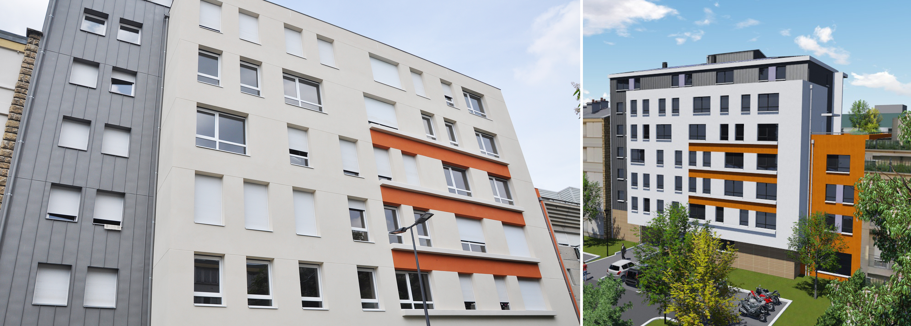 - Démolition et reconstruction d'une résidence sociale polyvalente de 66 logements, avec des locaux d'activités à rez-de-chaussée et un cabinet médical