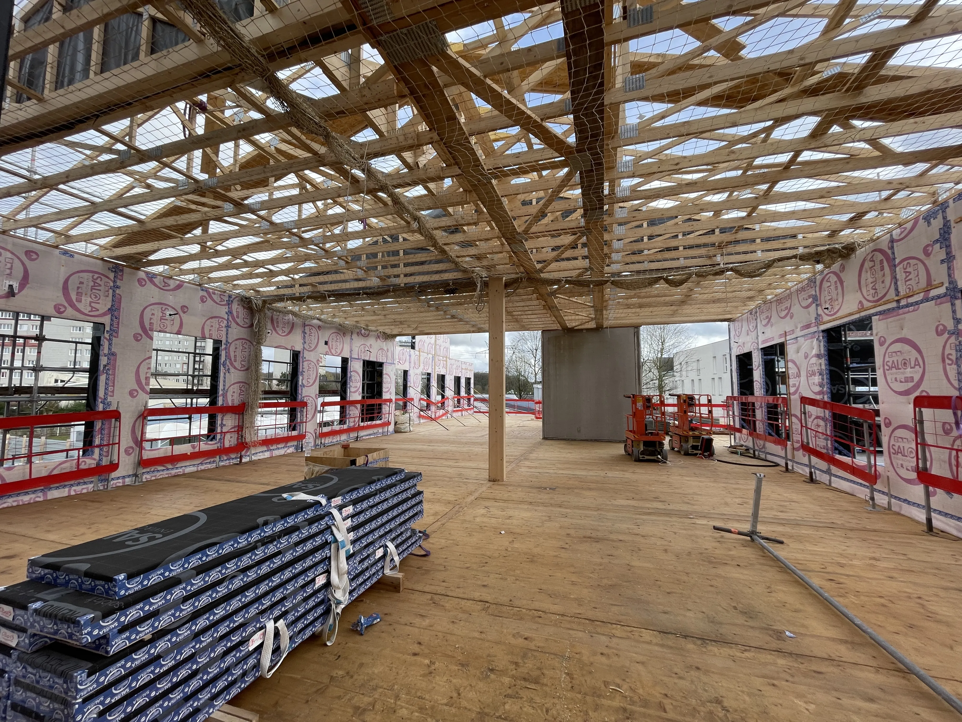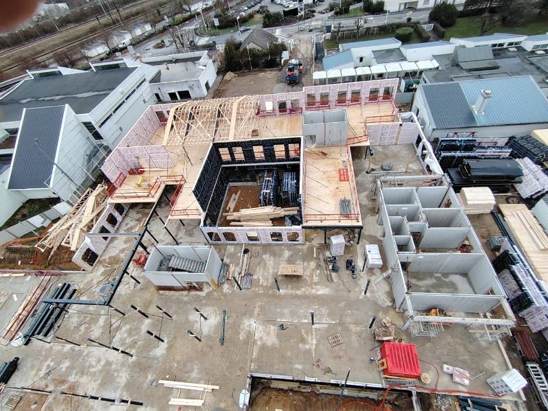 Ci-dessous, la préfabrication et le prémontage des murs dans les ateliers d'OBM (Entreprise générale mandataire) :