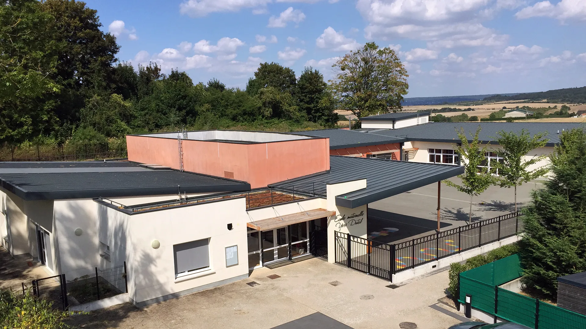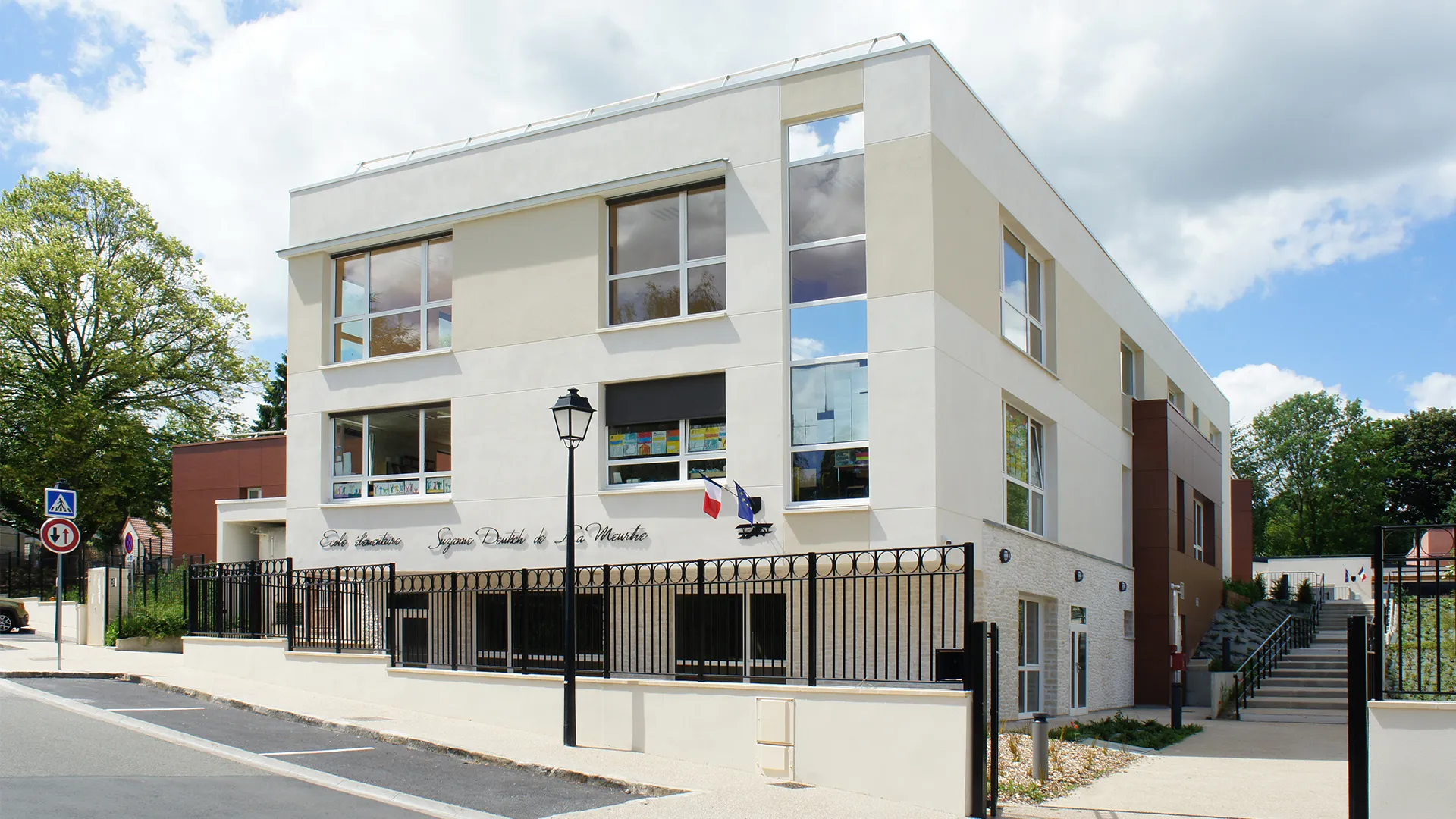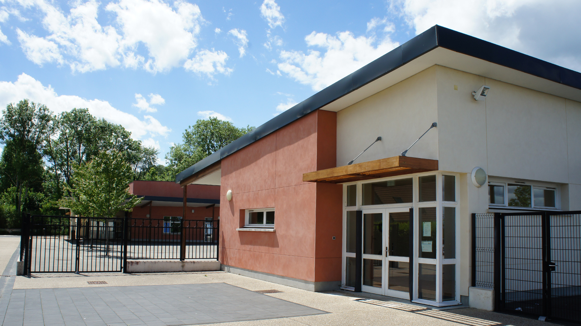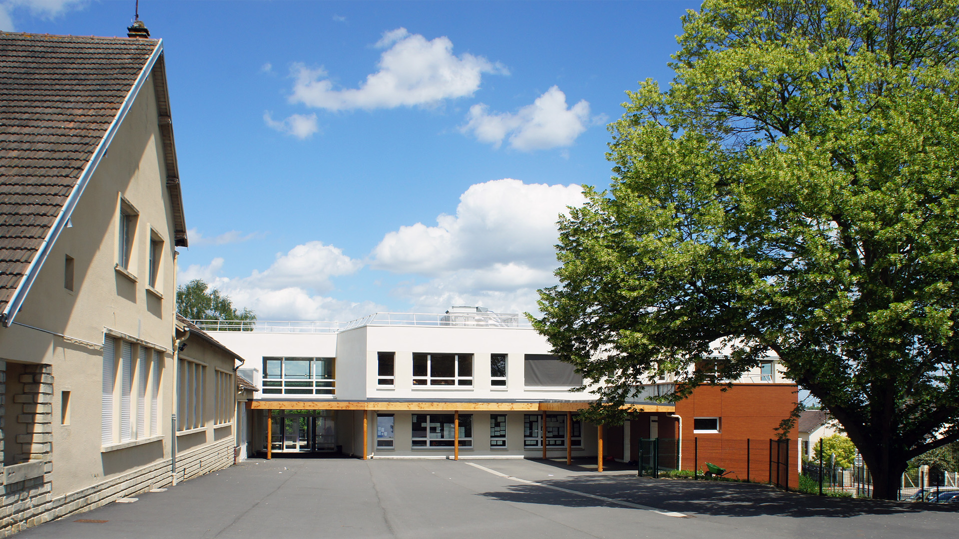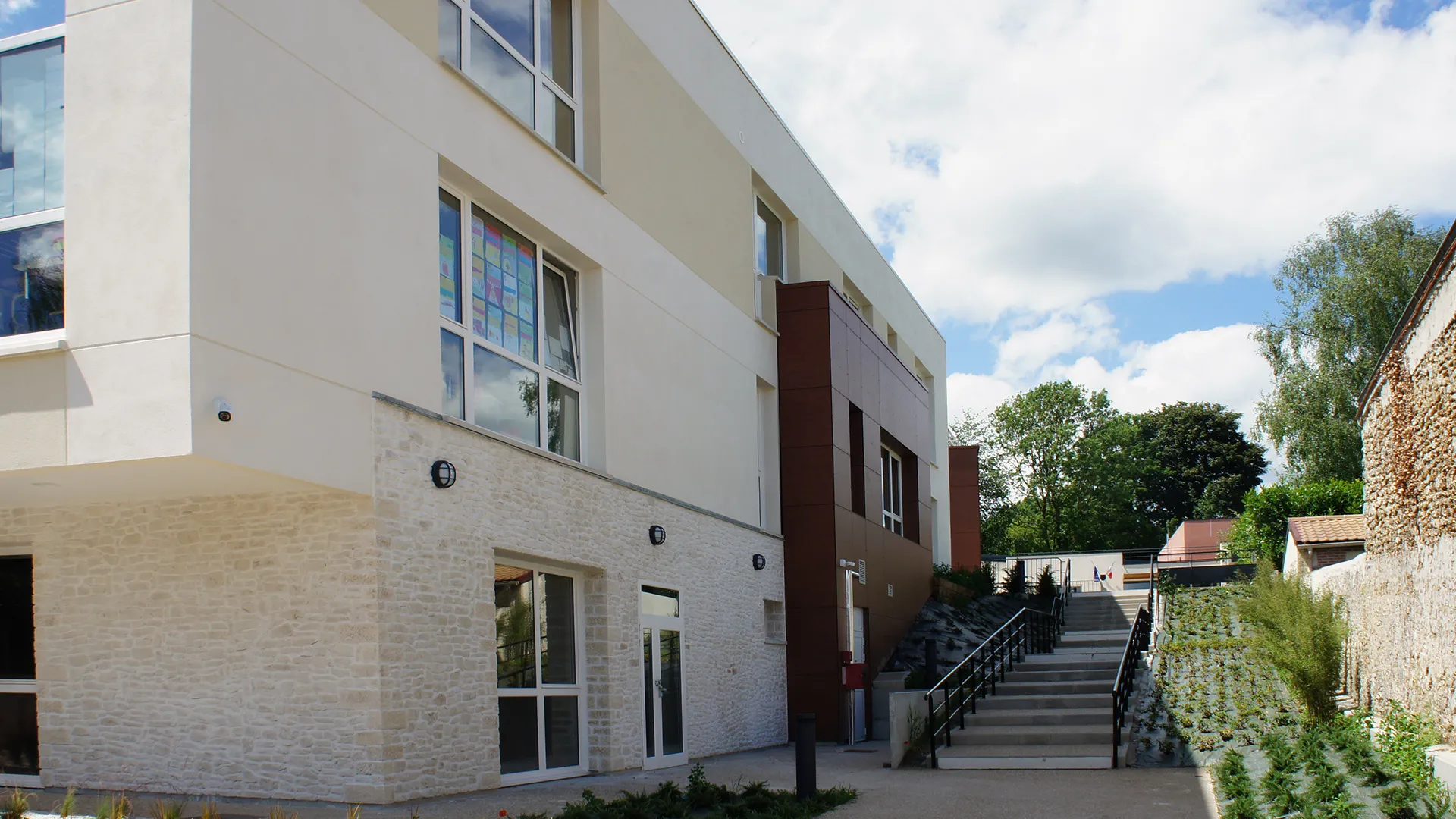 Dans le respect du phasage des travaux, la restructuration et l’extension des bâtiments existants ont permis de recomposer l’organisation de l’établissement tout en valorisant un édifice représentatif de l’architecture scolaire du XXᵉ siècle. Le hall d’accueil, l’escalier et l’ascenseur y ont été intégrés, en conservant l’accès traditionnel depuis le parvis, tandis que l’extension de la primaire, développée sur deux niveaux, accueille désormais l’enseignement général. Réalisé sous les prescriptions de l’Architecte des Bâtiments de France, le projet concilie respect patrimonial et performance énergétique en atteignant les standards d’un Bâtiment Basse Consommation. Conduit en site occupé grâce à un phasage précis, il avait pour objectif d’augmenter la capacité d’accueil de l’école tout en améliorant son efficacité énergétique et en offrant une insertion harmonieuse dans le site, préservant les espaces verts et affirmant une allure contemporaine ouverte sur la nature environnante.